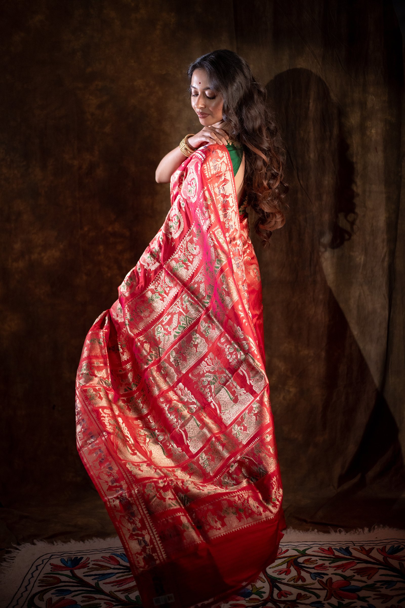 The Tale in Threads Baluchari saree is a celebration of Bengal’s storytelling legacy. Woven in vibrant tomato red pure silk and adorned with intricate gold and green motifs, it features mythological figures and floral patterns arranged in a grid-like layout. Crafted using the traditional Jala loom technique, this saree is a timeless piece for weddings, pujas, and heirloom gifting.
