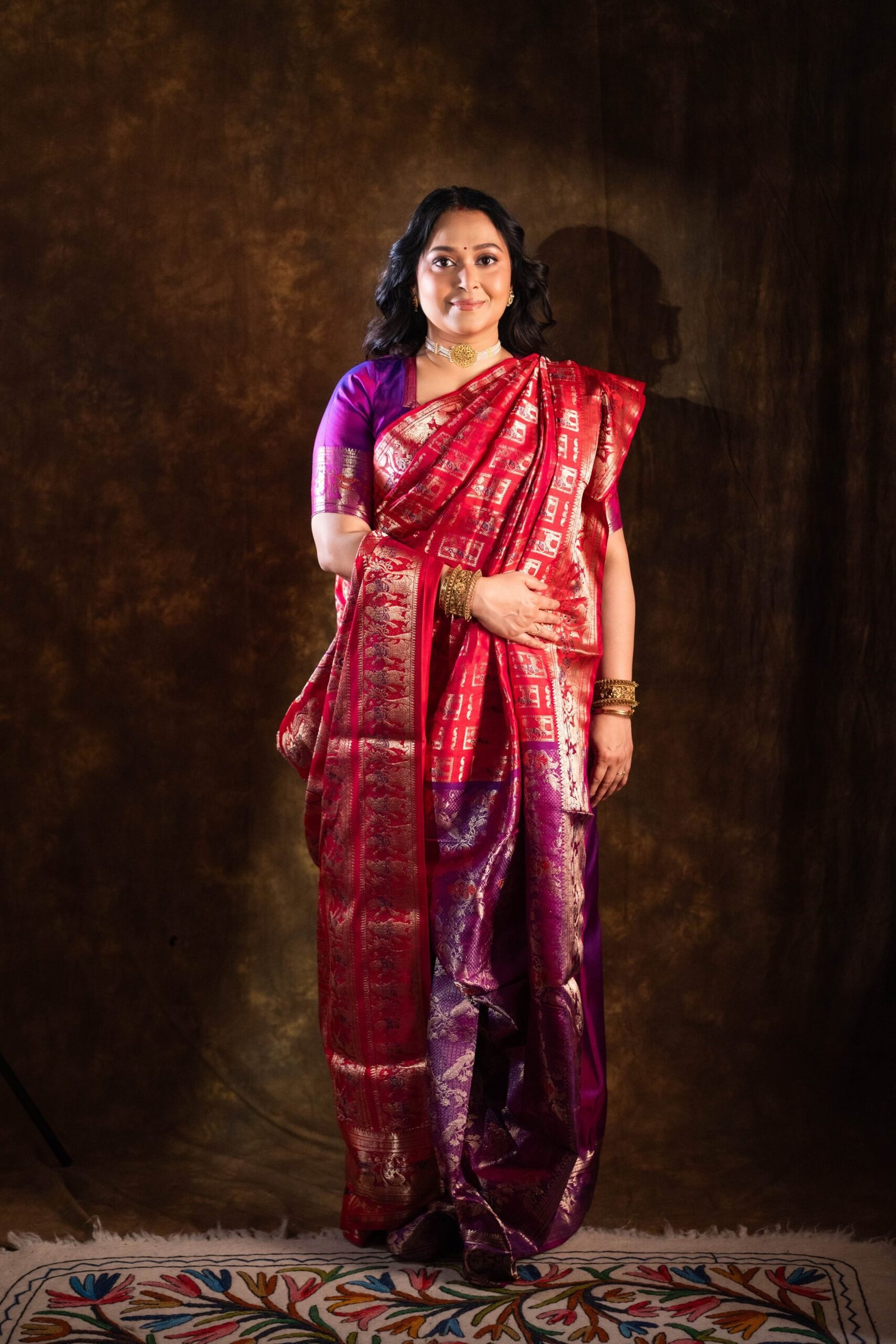 This Dual-Tone Purple & Royal Pink Swarnachuri Silk Saree in vibrant red and royal purple is a majestic tribute to Bengal’s textile artistry. Woven from pure silk and adorned with intricate gold Zari, it features mythological figures and floral motifs that evoke timeless tales. Paired with traditional jewellery, it’s a statement of elegance and cultural pride—perfect for weddings, classical performances, and heirloom gifting.