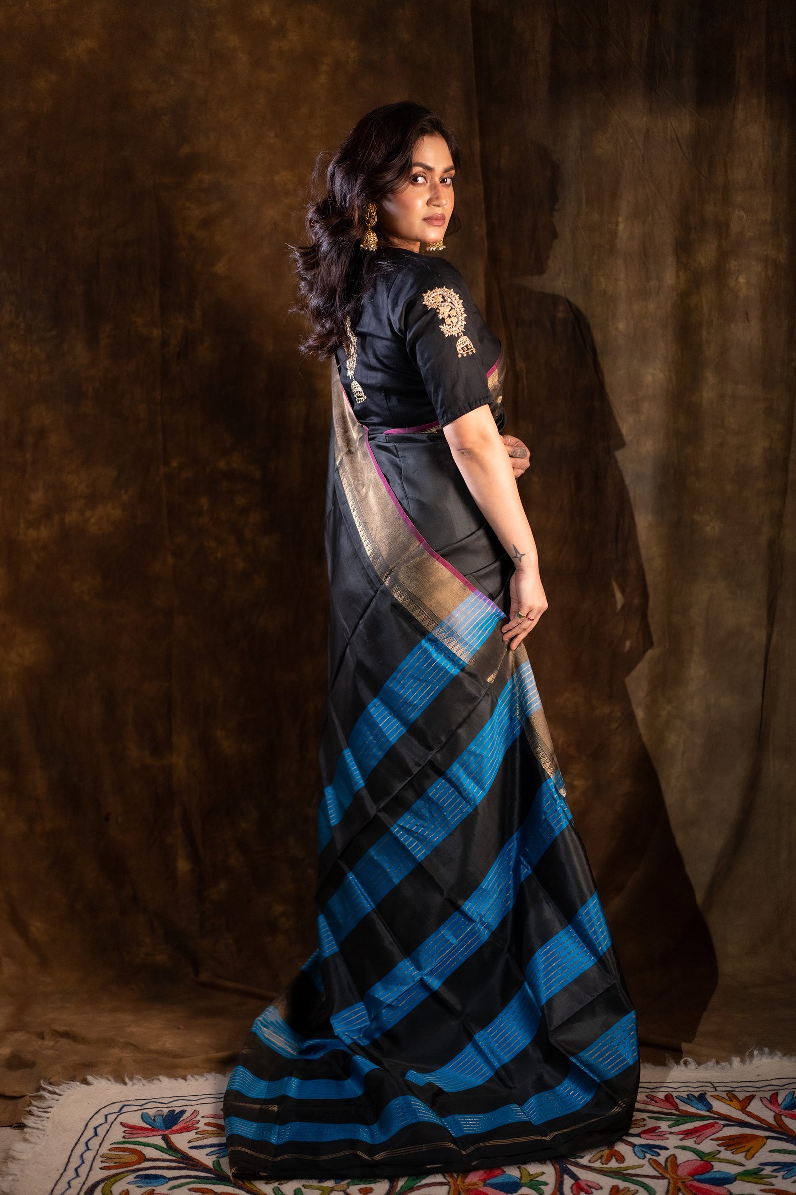 Midnight Stripes is a pure Katan silk saree that blends bold elegance with timeless craftsmanship. Woven in deep black with striking blue diagonal stripes and a shimmering gold border, it’s a statement piece for those who embrace tradition with flair. The fine silk weave gives it a rich texture and graceful drape—perfect for evening occasions, concerts, and festive gatherings.