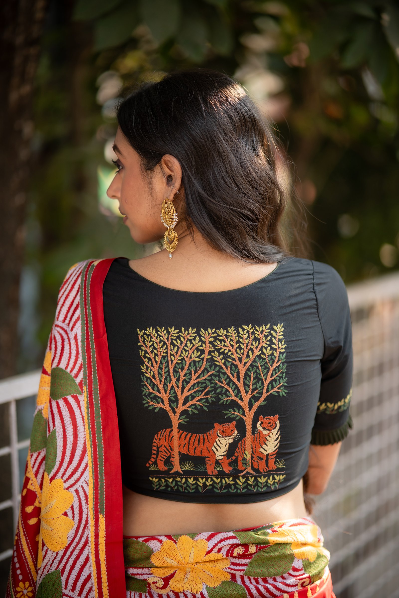 The Royal Bengal Tiger Kantha Embroidery Silk Blouse is a celebration of slow luxury and heritage craftsmanship. Crafted in pure silk, this blouse features intricate hand Kantha embroidery, where every stitch tells a story of tradition, patience, and artistry.
